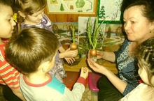 Мәктәпкә әзерлек төркеме балалары тәрәзә төбендәге суганнарның үсүен кызыксыну белән күзәтеп торалар.
