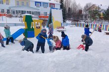 Кыш-ул могҗизалар ае. Күбәләкләп яуган ап-ак карлар, тәрәзәдәге боз чәчәкләре, аяз һәм салкын көнне аяк астындагы карның шыгыр-шыгыр килүе... Уртанчылар төркеме балалары уен мәйданчыгындагы карны көрәде. Аларга ярдәмгә зурлар төркеме балалары килде. Нәтиҗәдә курчакларны шудырырга кечкенә тау да өеп куйдылар./ Зима-это месяц чудес. Белоснежные снегопады с бабочками, ледяные цветы на окнах, скрип снега под ногами в ясный и холодный день... Дети средней группы боролись со снегом на детской площадке. На помощь им пришла группа взрослых детей. В итоге куклы насыпали на небольшую горку для катания.