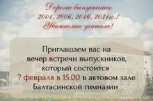 Уважаемые выпускники 2001, 2006, 2016, 2021 годов и преподаватели! Приглашаем Вас на «Вечер встречи» в гимназию, который состоится 7 февраля 2026 года в 15.00 ч.