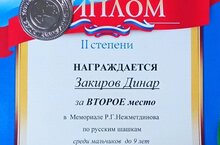 Закиров Динар, ученик 2 Б класса, занял II место в Мемориале Нежметдинова Р.Г. по русским шашкам среди мальчиков до 9 лет. Поздравляем! Молодец!