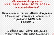 Уважаемые выпускники 1998, 2003, 2008, 2013, 2018 годов и преподаватели! Приглашаем Вас на «Вечер встречи» в гимназию, который состоится 4 февраля 2023 года в 15.00 ч.