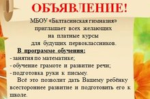 Администрация гимназииБалтач гимназиясе барлык теләүчеләрне булачак беренче сыйныф укучылары өчен түләүле курсларга чакыра.