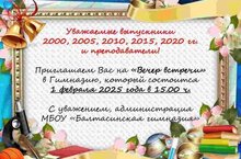 Уважаемые выпускники 2000, 2005, 2010, 2015, 2020 годов и преподаватели! Приглашаем Вас на «Вечер встречи» в гимназию, который состоится 1 февраля 2025 года в 15.00 ч.