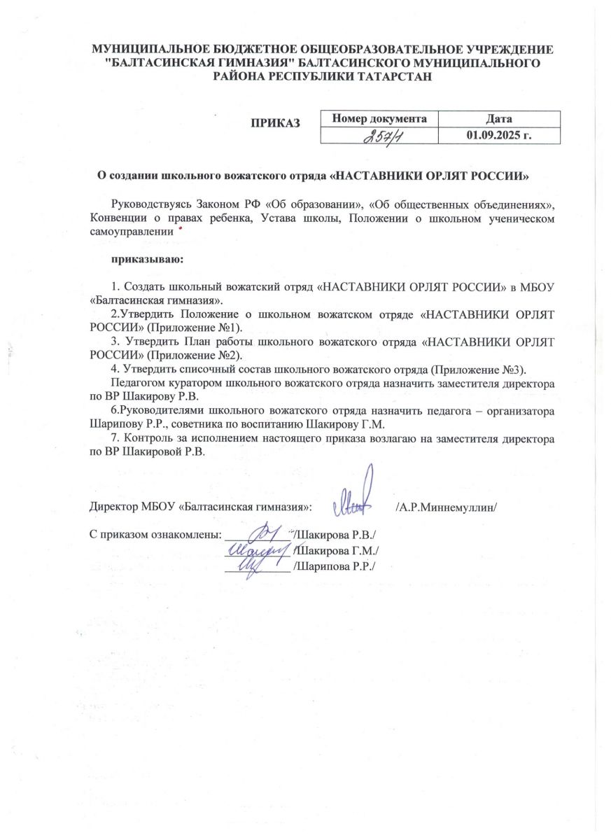 Приказ отряда "Волонтеры Победы" на 2025-2026 учебный год