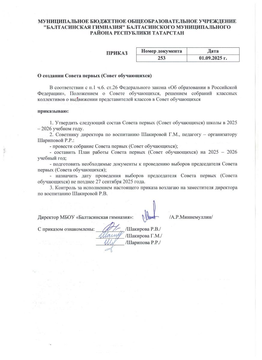 Приказ "О создании Совета Первых" (совет обучающихся) на 2025-2026 учебный год