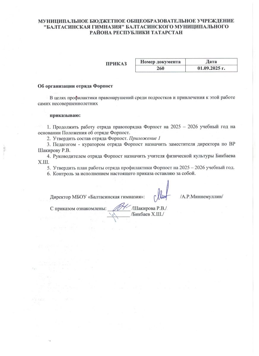Приказ отряда "Форпост" на 2025-2026 учебный год