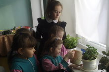Яз җитеп, кояшлар карый башлау белән тәрәзә төбендәге гөлләрне күчереп утырту, искеләренең төпләрен йомшарту, балчыклар өстәү эшенә керешәбез. Әлеге эштә өлкән сыйныф укучылары кечкенәләргә ярдәмгә килә. Алар нәниләрне гөлләрне тәрбияләү серләренә төшендерәләр.