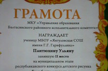 Мәктәбебез укучылары район күләмендәге конкурсларда теләп катнашалар. "Буду бдительным на льду" дип исемләнгән рәсем конкурсында да башлангыч сыйныф укучылары актив катнашты. 2 сыйныф укучысы Пантюхина Ульяна әлеге конкурста 2 урынны яулады һәм грамота белән бүләкләнде.