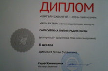 КФУ уздырган "Шигъри сабантуй-2016" бәйгесендә катнашып 9 сыйныф укучысы Сафиуллина Лилия "Яшь батыр" номинациясендә 2 дәрәҗәдәге диплом белән бүләкләнде.