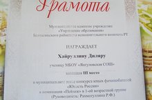 Уку елы ахырына якынлашуга карамастан район күләмендә конкурслар дәвам итә, ә без әлеге конкурсларда теләп катнашабыз һәм приәзлы урыннар да яулыйбыз. 7 сыйныф укучысы Хайруллина Диләрә “Юность России” дип исемләнгән фотографияләр конкурсында катнашып “Пейзаж” номинациясендә 3 урынны яулады.