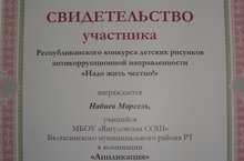 Республика күләмендә коррупциягә каршы “Надо жить честно”! дип исемләнгән рәсем конкурсында мәктәбебездән 6 класс укучысы Нәбиев Марсель катнашты. Ул “Аппликация” номинациясендә катнашучы буларак свидетельство белән бүләкләнде.