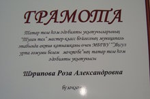 Татар теле һәм әдәбияты укытучылары арасында уздырылган “Туган тел” исемле мастер-класс бәйгесендә татар теле укытучысы Роза Александровна катнашты. Ул әлеге бәйгедә, уңышлы чыгыш ясап, грамотага ия булды.
