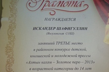 Район күләмендә уздырылган “Алтын каләм” конкурсында мәктәбебездән Шафигуллин Искәндәр катнашты. Ул 14 яшькә кадәрге укучылар арасында 3 урынны алды һәм грамота белән бүләкләнде.
