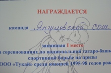 Район күләмендә ООО “Тукай” призына татарча көрәш бәйгесе уздырылды. Әлеге бәйгедә мәктәбебез командасы 1 урынны яулады. Менә алар,үз авырлыкларында призлы урыннар алган батырларыбыз: Муллахметов И., Рафиков И., Ахметханов И., Рамазанов Р., Ахметханов И.