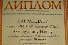 7 класс укучысы Ахмадуллина Илүсә, республика күләмендә узучы “Миру-мир” дип исемләнгән плакатлар конкурсының район этабында катнашып, 3 урынны яулады һәм грамота белән бүләкләнде.