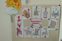 С детьми старшей группы в рамках недели русского языка просмотрели презентацию "Чудеса дымковской игрушки". Дети вместе с родителями раскрашивали силуэты дымковских игрушек. В прихожей организовали выставку "Дымковские игрушки"