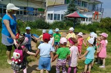 Сегодня у нас викторина "День доброты" После проведения викторины на свежем воздухе дети показали маленькте инсценировки с игрушечными животными.
