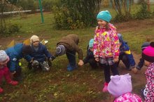 Бүген без каенлыкка экскурсиягә бардык. Каенлыкны ерактан күзәттек. Иң биек агач, куакны билгеләдек. Бакчада нинди куаклар үскәнен әйттек. Һәм яфраклар җыйдык. Ә ул яфраклардан мәйданчыкка кайткач, төрле бизәкләр төшереп уйнадык.