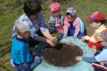 Уртанчы төркем балалары югары категорияле тәрбияче Хәйруллина Наҗия Әдһәмовна белән узләре үстергән чәчәк үрентеләрен утырталар. 21.05.2015