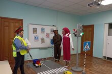Воспитатели детского сада показали воспитанникам развлечение "Маша и Медведь учатся правилам дорожного движения".