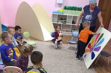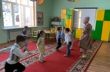 Фазылзянова Зарина проводит игру " Это чей?, Это чья? " в старшей группе с игрушечной мебелью.