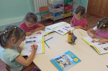 Воспитанники средней группы начали изучатҗ русский язык. А выполнение заданий в рабочих тетрадях для них одно удоволҗствие. У детей закрепляется памятҗ, мышление, говоря меңду собой поввторяют изученную лексику.