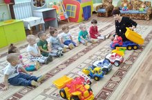 В соответствии с планом профориентации дети первой группы раннего возраста ознакомились с профессией водителя. По этой теме была проведена беседа с детьми. Дети учились называть имена машин, играли в игру" Воробьи и шофер".