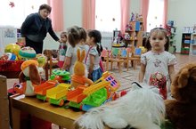 Воспитанники младшей группы "побывали" в магазине игрушек. Там они закрепили термины один-много, короче-длиннее.