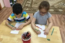 Воспитанники подготовительной к школе группы украшают татарскую национальную обувь. Так они продолжают знакомиться с татарскими национальными узорами, у них пробуждается интерес к татарскому национальному костюму.