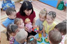 Кечкенәләр төркеме балалары әвәләү шөгылендә зур кисәктән кечкенә кисәк алу, аны турыга ике уч арасында әвәләүне өйрәтү максатыннан Алсу курчакка конфетлар әвәләделәр. Балалар бик кызыксынып һәм теләп эшләделәр. Шөгыль ахырында Алсуны конфетлар белән сыйладылар.