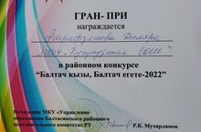 4 апреля в районе прошёл конкурс среди девушек и юношей "Татар кызы", "Татар егете". В данном конкурсе из нашей школы участвовала ученица 10 класса Ашрафзянова Диляра, которая удостоена высшей награды — Гран-при. Поздравляем Диляру, её наставника и помощника, ученика 11 класса Сагтдинова Р. этой победой и желаем в будущем больших успехов