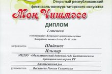 Шайхиев Ильмир участвовал на республиканском фестивале конкурсе татарского искусства "Мон чишмэсе" и награжден Дипломом 1 степени в номинации "Вокальное исполнительство. Эстрадное пение" (соло) 4-6лет/Шәйхиев Ильмир "Моң чишмәсе" республика татар сәнгате конкурсында катнашып, "Вокаль башкару" номинациясендә 1 нче дәрәҗә Диплом белән бүләкләнде/Зечкыласьком!/