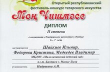 Воспитанники подготовительной группы Фёдорова Христина, Шайхиев Ильмир и Медведев Владимир приняли участие на открытом республиканском фестиваль-конкурсе и награждены дипломами ll степени/Мәктәпкә әзерлек төркеменнән - Фёдорова Х., Шәйхиев И. һәм Медведев В. ачык республика фестиваль-конкурсында катнашып ll нче дәрәҗә дипломнар белән бүләкләнделәр/Зечкыласьком пиналъёсыз/