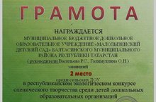 Наш детский сад награжден грамотой среди сельских ДОУ в республиканском экологическом конкурсе сценического творчества среди детей дошкольных образовательных организаций/Авыл мэктэпкэчэ белем биру оешмалары арасында Республика экологик ижади сэхнэ конкурсында катнашып 2 урын алдык/Зечкыласьком!/