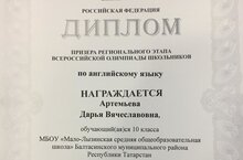 Поздравляем ученицу 10 класса Артемьеву Дарью, призера регионального этапа Всероссийской олимпиады школьников по английскому языку. Желаем дальнейших успехов!