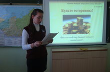 В рамках месячника антикоррупционной направленности под лозунгом «Наш район – территория свободная от коррупции» в 10 классе прошёл классный час на тему «Защити себя сам», направленный на профилактику по противодействию коррупции. Учащиеся познакомились с уголовными статьями мошенничества, видами мошенничества, и способами защиты от мошенников.