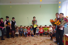 Волонтеры отряда "Горящие сердца" школы провели акцию "Поздрав воспитателя". Поздравили воспитателей детского сада "Родничок" с празником с Днем работников дошкольного образования.