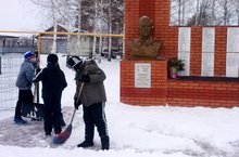 Учащиеся нашей школы круглый год ухаживают за памятником Б. Рахимову. В декабре месяце учащиеся 5 класса расчистили снег вокруг памятника и подмели дорожки.