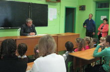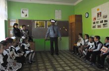 Мәктәптә "Игътибар, балалар!" айлыгы кысаларында, балаларның юлда иминлеген саклау максатында, ГИБДД начальнигы Шафигуллин Фәргать Тәлгатович белән очрашу булды.