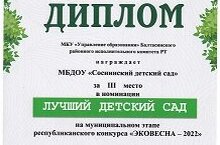 Балалар бакчасы коллективы "ЭКОЯЗ - 2022" Республика конкурсының муниципаль этабында "Иң яхшы балалар бакчасы" номинациясендә 3 урын өчен диплом белән бүләкләнде.
