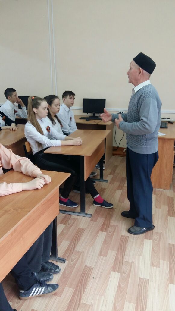 Югары сыйныф укучылары сугыш чоры баласы Нигъматуллин Рәфкать абый белән очрашуда катнаштылар. Очрашу барышында укучылар сугыш елларындагы авыр тормышы үз җилкәсендә татыган ветеранны зур кызыксыну белән тыңладылар.