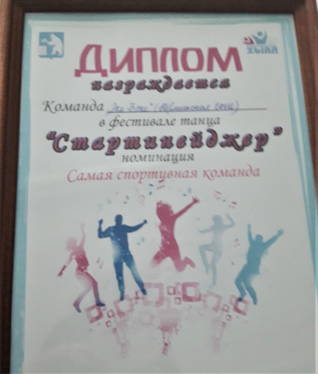 Опубликовано: 05.12.2019”Стартинейджер” бию фестивалендә ”Әке-бәке” бию төркеме (фотода сары футболкаларда) “Иң спорт сөюче команда” номинациясендә җиңүче булды. Гатауллина Адилә - “Королева Танцпола” номинациясендә җиңде.