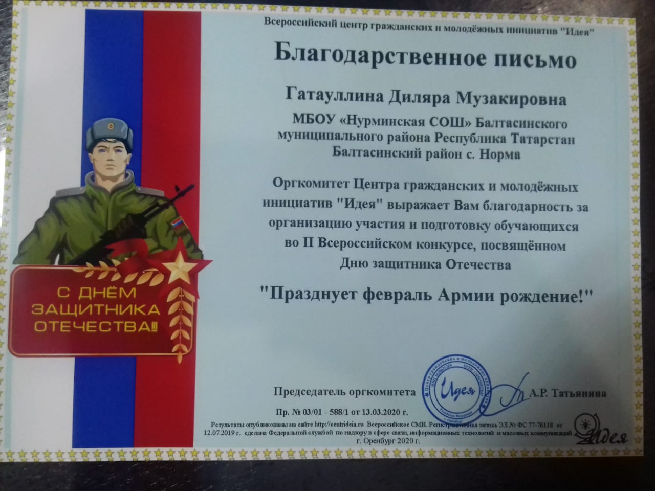 Опубликовано: 27.04.20202б сыйныфы укучысы Галимҗанова Әдилә “Җиңүне бәйрәм итәбез” Бөтенроссия конкурсында 1-2 дәрәҗә дипломнарга ия булды. Җитәкчесе Гатауллина Д.М.