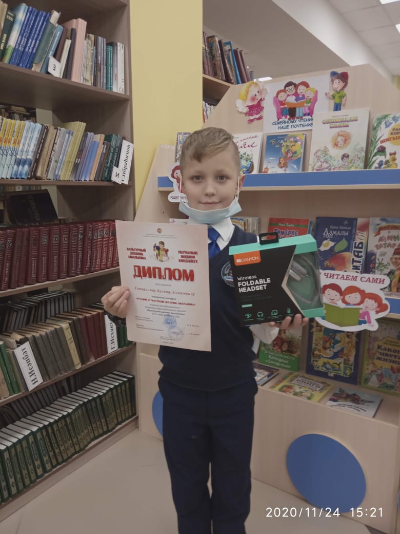 Опубликовано: 24.11.2020Обучающиеся 5а класса Гарифуллин Самат, 3 б класса Гатауллин Булат стали победителями республиканского конкурса “Культурный дневник”. Гатауллина Лилия Рамилевна была отмечена как “Самый культурный родитель”.
