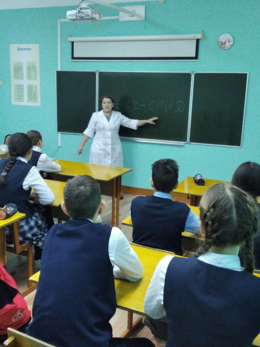 1. 8 нче сыйныфта мәктәп шәфкать туташы Ильясова Раилә Камил кызы сыйныф сәгатендә СПИД, аның күчү юллары, саклану чаралары турында укучыларга сөйләде.