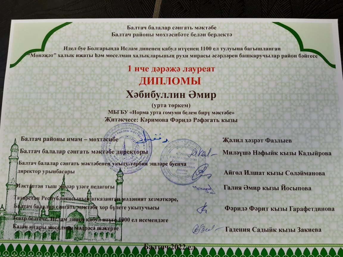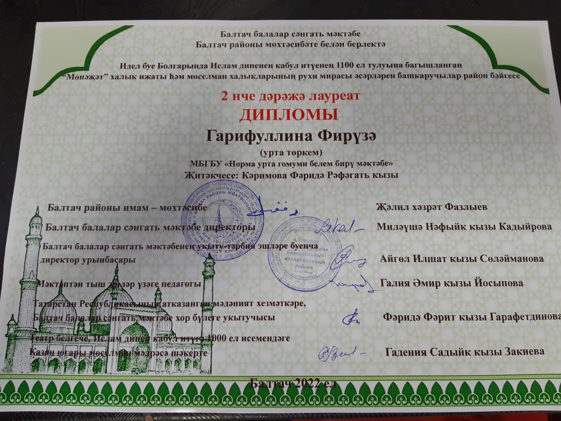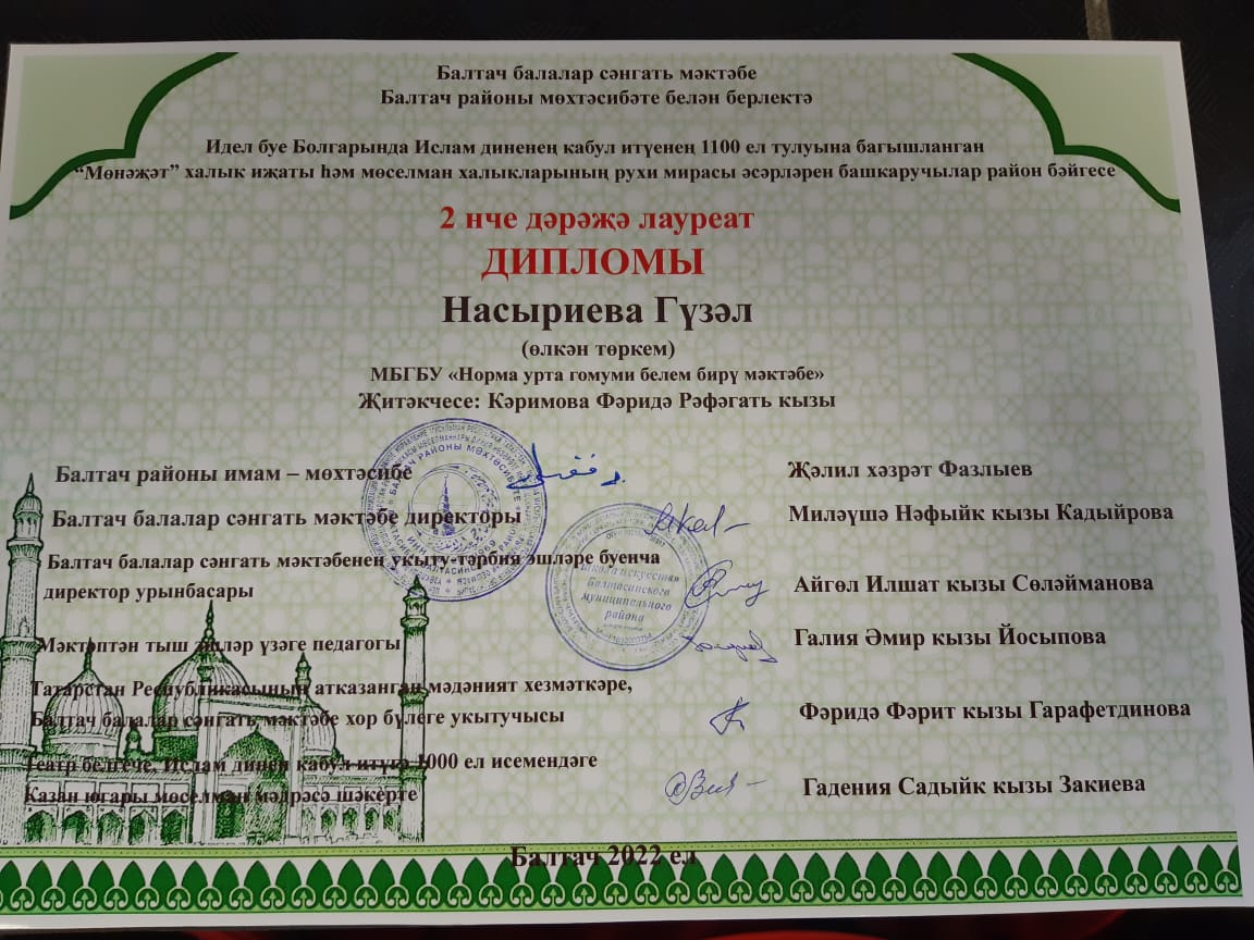Газизуллина Камилә II дәрәҗә дипломга лаек булды. Җитәкчеләре Каримова Фәридә Рәфәгать кызы.