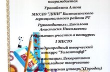 Учащиеся художественного отделения (преподаватель А.Н.Данилова) Кумаева Кристина - 1 место (Работа "Расписная утварь" (Хохлома), номинация "Декоративно-прикладное творчество", 3 место (Рисунок "Осень"), номинация рисунок. Уразайкина А. - 1 место (Работа "Расписная утварь" (Городец), номинация "Декоративно-прикладное творчество", 3 место (Работа "У пруда"), номинация "Рисунок".
