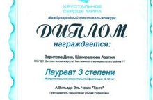 Фортепианный дуэт Зарипова Дина и Шакирзянова Азалия (руководитель Габдуллина Г.Р.) стали лауреатами 3 степени на Международном фестивале-конкурсе "Хрустальное сердце мира". Поздравляем наших победителей!