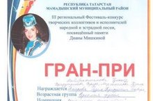 22 января в городе Мамадыш состоялся III Региональный фестиваль-конкурс творческих коллективов и исполнителей народной и эстрадной песни, посвящённый памяти Дианы Мишкиной. Вокальный квинтет преподавателей ДШИ (Аскарова Г.Р., Гарафутдинова Ф.Ф., Гарифуллина Э.М., Миргалимова Г.З., Хабибрахманова Г.А.) стали обладателями ГРАН-ПРИ. В составе жюри - заслуженный артист РТ, народный артист РТ, профессор кафедры искусств народов Поволжья Института филологии и искусства К(П)ФУ - М.В.Галеев, директор Государственного фольклорного ансамбля кряшен "Бермянчек" - А.В. Поляков, руководитель исполнительного комитета Мамадышского муниципального района - С.М.Гимранов.