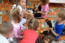 Дети старшей группы вместе с воспитателем купили кукле Маше осеннюю одежду.